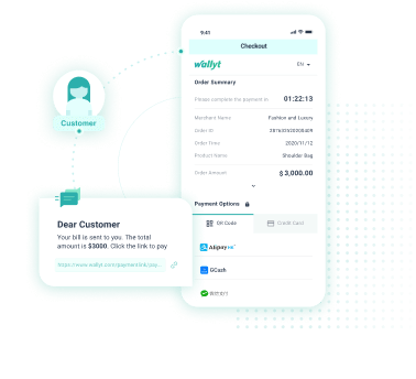 Customer receives payment link and choose a variety of payment methods including QR code or card and other aggregate payment channels. Wallyt provides not only payment link products but also payment channels integration.
